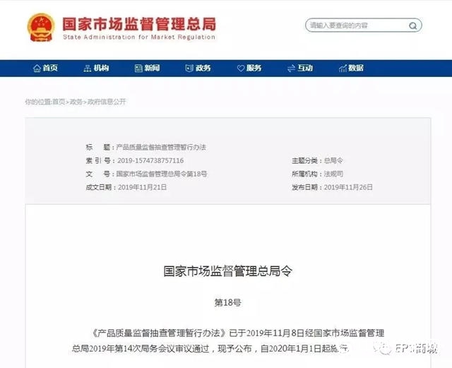 ????????11月26日,國(guó)家市場(chǎng)監(jiān)督管理總局發(fā)布《產(chǎn)品質(zhì)量監(jiān)督抽查管理暫行辦法》,將自2020年1月1日起施行?!掇k法》共56條,明確了監(jiān)督抽查的組織、抽樣、檢驗(yàn)、異議處理、結(jié)果處理及相關(guān)人員應(yīng)承擔(dān)的法律責(zé)任,對(duì)于加強(qiáng)產(chǎn)品質(zhì)量監(jiān)督管理、規(guī)范產(chǎn)品質(zhì)量監(jiān)督抽查工作、保護(hù)消費(fèi)者的合法權(quán)益有重要意義。