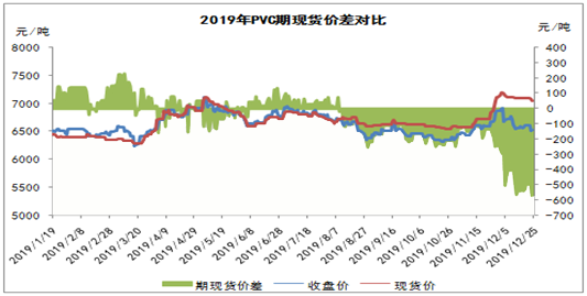 ????????近日,受市場供應(yīng)面有一定提升以及下游接貨不佳影響,PVC行情轉(zhuǎn)入跌勢。PVC期貨偏弱震蕩,對現(xiàn)貨市場價格形成一定打壓,市場價格承壓下跌。此外,期現(xiàn)貨價差再創(chuàng)新高,最高達(dá)570元/噸左右。由上圖可以看出,進(jìn)入2019年四季度,PVC期限價差逐漸擴大,基本維持在500-600元/噸之間,而期貨價格遠(yuǎn)遠(yuǎn)低于現(xiàn)貨價格,超出正常范圍。因此單從期現(xiàn)價差方面看,后期將逐漸修復(fù)步入正軌,現(xiàn)貨大幅下降的可能性偏大。