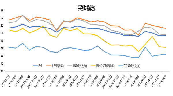 ????????值得注意的是,隨著中美貿(mào)易戰(zhàn)的不斷升級(jí),市場(chǎng)信心指數(shù)嚴(yán)重受損。PMI指數(shù)已經(jīng)連續(xù)兩個(gè)月在榮枯分界線以下,這表明當(dāng)前經(jīng)濟(jì)下行壓力不容小覷。新訂單指數(shù)連續(xù)兩個(gè)月在下降,一直是在榮枯分界線以下,這也說(shuō)明企業(yè)整體訂單的情況不好,尤其新出口訂單是出現(xiàn)明顯下滑,上半年出口訂單受趕出口影響出現(xiàn)反彈,但下半年出口會(huì)出現(xiàn)回落。外部環(huán)境導(dǎo)致的外需下滑,以及它給整個(gè)經(jīng)濟(jì)增長(zhǎng)帶來(lái)的壓力,是不容低估的。