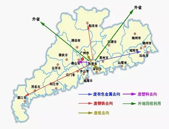 ????????目前,東莞市廢紙主要在本地造紙廠回收利用;廢塑料主要流向佛山等珠三角地區(qū)的塑料造粒加工企業(yè);廢鋼鐵主要運(yùn)往韶關(guān)、湛江、省外城市等地區(qū)進(jìn)行冶煉;廢有色金屬、廢電子主要流向粵東進(jìn)行回爐再用。