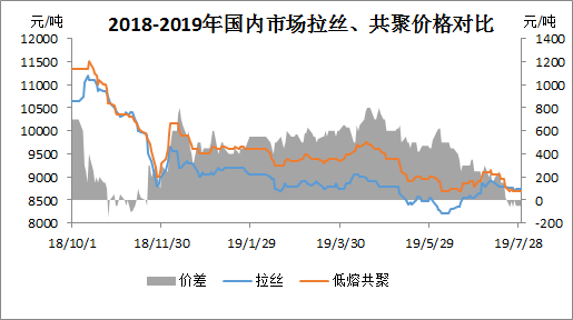 ????????進入7月份以來,隨著PP期貨的大幅拉漲,作為標品的PP拉絲跟漲迅速,作為非標品的共聚,漲幅跟進較為緩慢,國內聚丙烯現(xiàn)貨市場拉絲與共聚市場價格出現(xiàn)平水的現(xiàn)象,從2016年至今拉絲與共聚平水的現(xiàn)象僅出現(xiàn)過兩次,目前已經(jīng)進入倒掛態(tài)勢,拉絲價格高出共聚300元/噸之多。