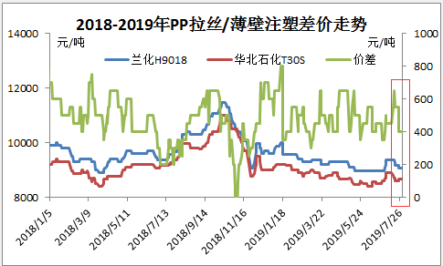 ????????從上圖可以看出,7月份,PP拉絲料/薄壁注塑料價(jià)差開始出現(xiàn)縮小趨勢。6月底7月初,薄壁注塑料和拉絲料價(jià)差在600元/噸左右,7月底,價(jià)差縮小至400元/噸,在利潤方面一直占有優(yōu)勢的薄壁注塑料,開始逐漸走下神壇。