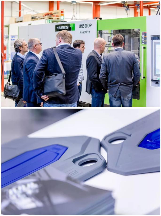 ????????伊之密與合作伙伴Frimo提供的ReactPro方案,將注射成型與聚氨酯(PUR)包覆工藝結(jié)合在一起,更簡(jiǎn)單、更模塊化、更靈活、更具成本效益。在Frimo總部舉行的聯(lián)合技術(shù)開(kāi)放日上,第一套高度集成和自動(dòng)化的ReactPro系統(tǒng)亮相,現(xiàn)場(chǎng)生產(chǎn)帶聚氨酯表面的發(fā)動(dòng)機(jī)蓋,吸引了不少感興趣的專業(yè)觀眾。