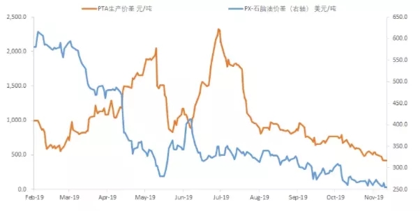 ????????整個(gè)產(chǎn)業(yè)上游都在擴(kuò)張,而終端的需求一直不景氣,這種情形下,依靠變化莫測的原油市場和個(gè)別裝置檢修一兩周對市場預(yù)期也不會有太大的影響。而目前進(jìn)入2019年年尾,今年P(guān)TA價(jià)格不斷創(chuàng)出新低。PTA價(jià)格重心下移的原因十分明顯,主要是大量PTA新裝置、尤其是大煉化配套PX新裝置年內(nèi)持續(xù)投產(chǎn)。