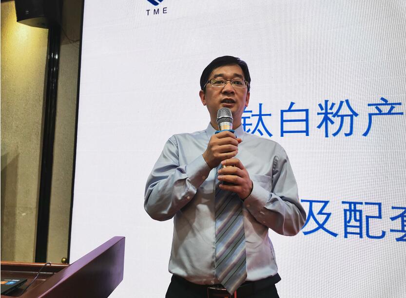 圖為壹化港(上海)網(wǎng)絡科技有限公司總經(jīng)理蔡緒波在會上作《鈦白粉產(chǎn)業(yè)融資需求及配套解決方案》的主旨報告。