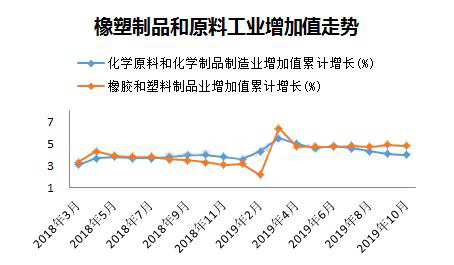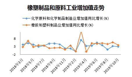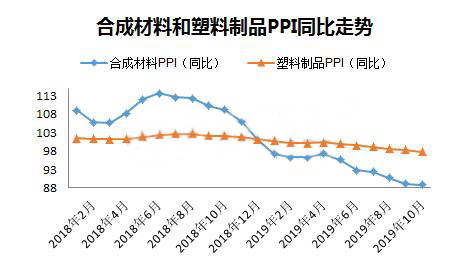????????10月份,化學(xué)原料和化學(xué)品制造業(yè)增加值同比增長3%,橡膠和塑料制品業(yè)增加值同比增長3.9%,顯然下游制品業(yè)增速還是快于上游原料,兩者增速差連續(xù)三個(gè)月收窄,源于10月份制品業(yè)下降速度快于原料。去年10月份PE、PP等塑料原料價(jià)格揭開下滑序幕,橡塑制品的增速明顯低于原料,總體看隨著原料端價(jià)格下跌,終端產(chǎn)品成本降低,從塑料制品增長角度看制品行業(yè)目前形勢略好于去年。