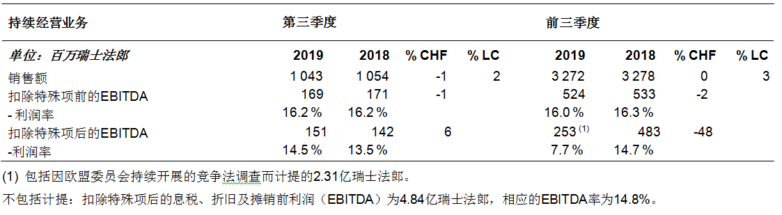 ????????· 持續(xù)經(jīng)營業(yè)務(wù)扣除特殊項(xiàng)(不包括歐盟委員會計提)后息稅、折舊及攤銷前利潤(EBITDA)穩(wěn)定在4.84億瑞士法郎