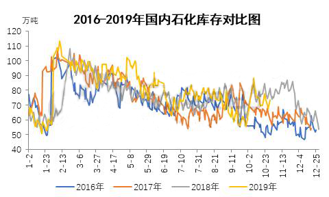 ????????2019年以來,從國內(nèi)石化主要塑料產(chǎn)品庫存情況來看,一、二季度受需求低迷,國內(nèi)產(chǎn)能不斷增加預(yù)期等因素影響,庫存高于往年季節(jié)性同期,但進入三季度,塑料下游主要需求數(shù)據(jù)向好,塑料制品產(chǎn)量與塑料制品出口量恢復(fù)增長,石化庫存去化理想,庫存陸續(xù)接近往年季節(jié)性同期水平。尤其8月底及9月份,國內(nèi)石化庫存水平已經(jīng)明顯低于前三年歷史水平。進入10月份,由于國慶假期原因,庫存快速累積至歷史高位,但受中美貿(mào)易關(guān)系緩和,重啟貿(mào)易談判以及沙特突發(fā)“黑天鵝”事件利好原油等宏觀因素利好,石化庫存快速下降和,截止10月份下旬,石化庫存已經(jīng)低于2018年同期6-7萬噸。