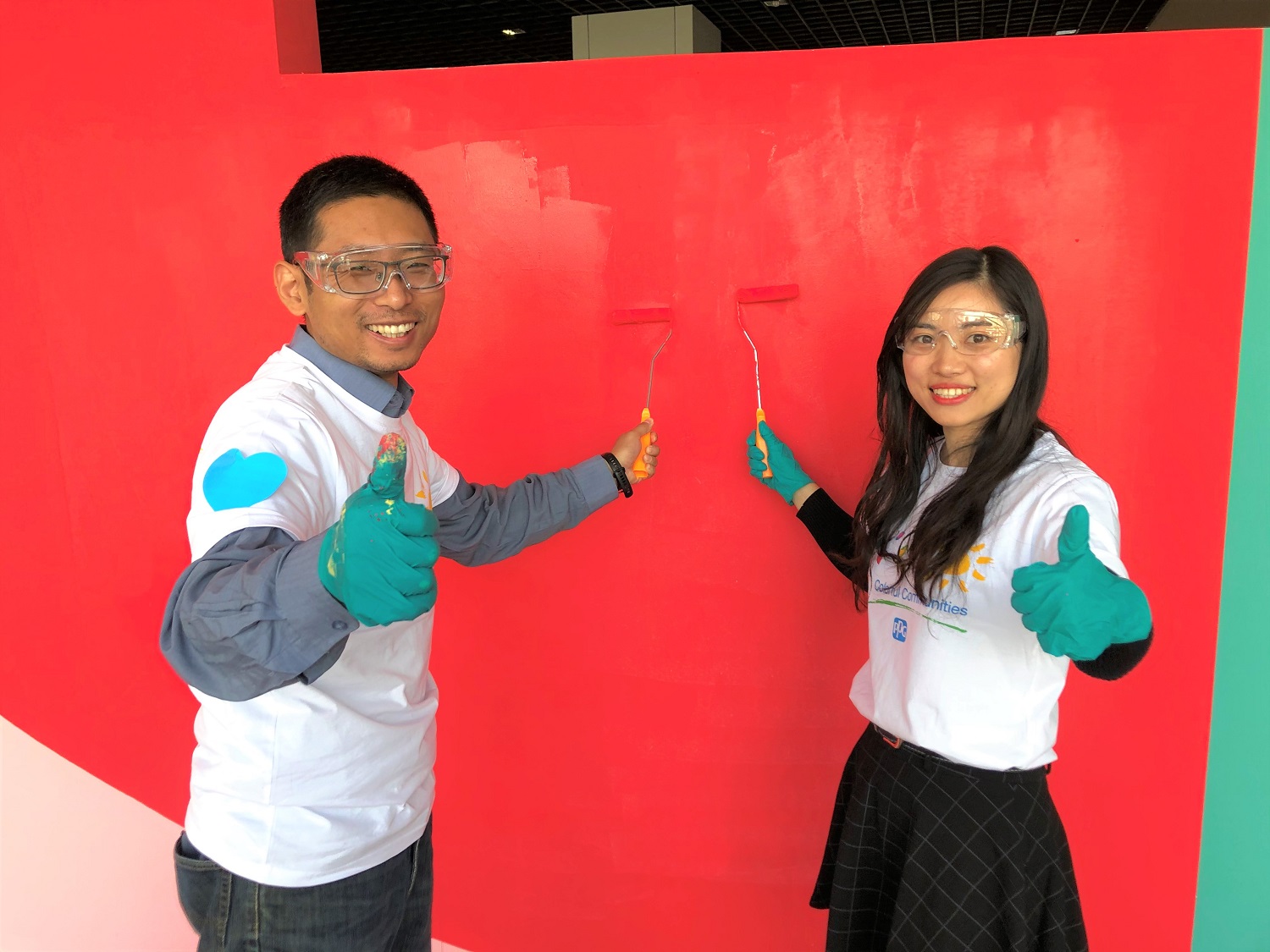 ????????受到文體活動(dòng)中心建筑外立面為多種形狀的啟發(fā),此次粉刷活動(dòng)以“七巧板”為主題,運(yùn)用了七種不同顏色來營造出了一個(gè)明亮歡快、充滿運(yùn)動(dòng)活力的活動(dòng)空間。PPG志愿者和社區(qū)代表志愿者不僅對(duì)文體活動(dòng)中心的活動(dòng)室內(nèi)墻與走廊進(jìn)行了美化,還和他們的孩子一起繪制了有關(guān)航空和社區(qū)文化主題的長卷畫。
