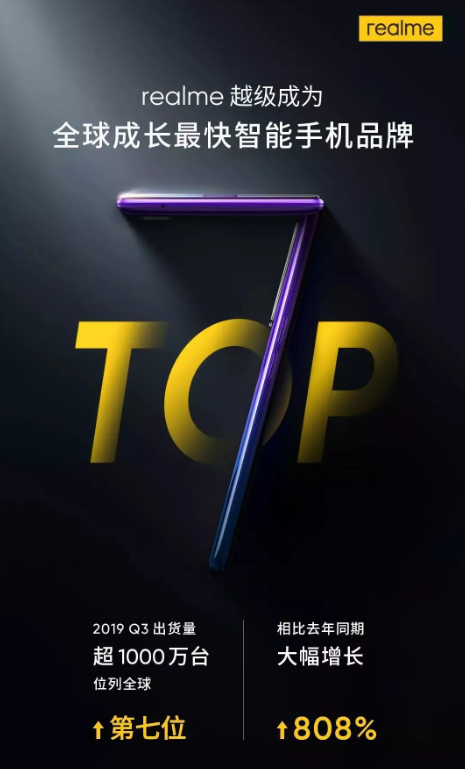 ????????據(jù)Counterpoint最新調(diào)研報告:realme手機第三季度出貨量超1000萬臺,同比增長808%,位列全球前7,成為全球成長最快的智能手機品牌。
