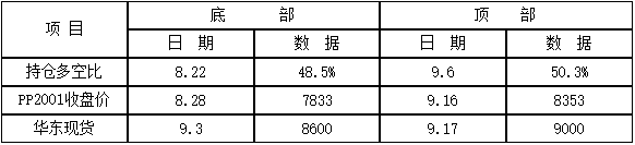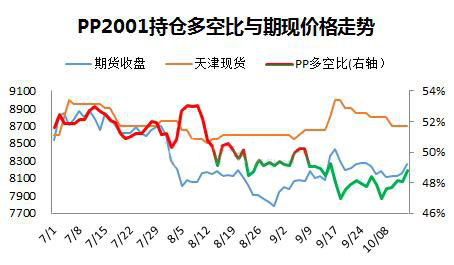 ????????第二、7月以來多空比曲線下行過程中,PP期現(xiàn)價格并不同步,多空比形成階段性底部和頂部相對領(lǐng)先,在50%臨界線之下,多單逐步增加,多空比逐步提升,此時配合基本面情況,有擇機(jī)介入短多的機(jī)會。多空比在8月22日達(dá)到階段性底部48.5%,之后開始一波反彈,多空比的底部領(lǐng)先期現(xiàn)價格一周左右時間,8月28日PP2001收盤7833元/噸,華東現(xiàn)貨在9月3日8600元/噸,相繼形成底部;9月6日,持倉多空比50.3%形成階段性頂部,且50%臨界線之上僅僅維持兩天就再次轉(zhuǎn)頭下行,此次多空比領(lǐng)先了期現(xiàn)價格10天左右。總之當(dāng)多空比、期貨和現(xiàn)貨價格同向而行,“共振”之際,方可順勢而為。