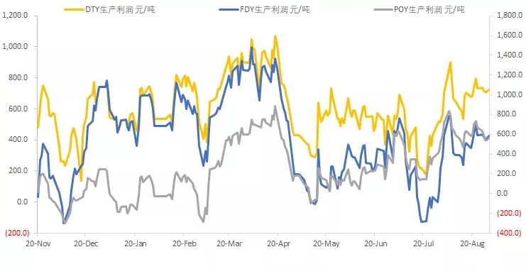 ????????最近聚酯產(chǎn)業(yè)鏈下游利潤和開工率齊升,說明終端對聚酯的需求還不錯(cuò),上游讓渡的利潤也盤活了下游企業(yè)。長絲的產(chǎn)銷最近也有所回升,8月份平均產(chǎn)銷率為83%,基本上與去年同期持平,反觀7月份的平均產(chǎn)銷率只有55%,8月份下游真的是有很大起色,但是上游PTA毫無起色。