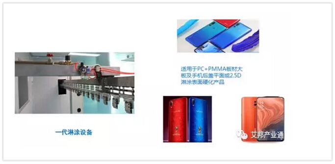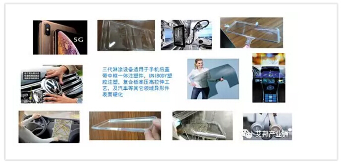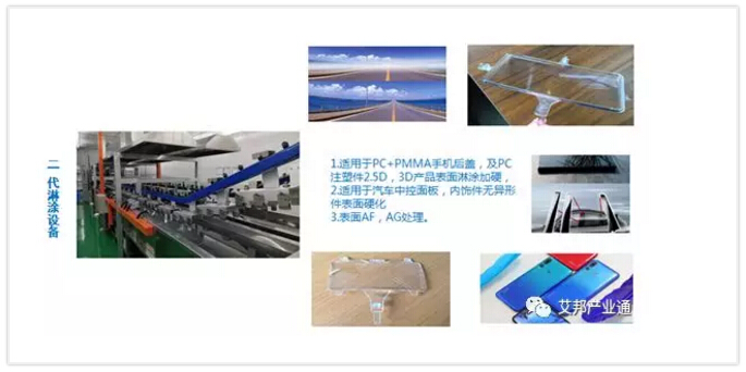 ????????二代淋涂設(shè)備主要應(yīng)用于PC+PMMA手機(jī)后蓋,及PC注塑件2.5D,3D產(chǎn)品、汽車中控面板,內(nèi)飾件無異形件表面硬化、表面AF、AG處理。