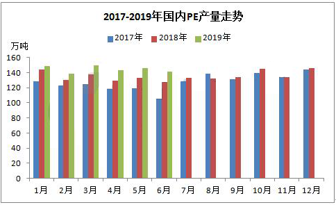 ????????據(jù)統(tǒng)計(jì),2019年上半年國(guó)內(nèi)PE產(chǎn)量在867.21萬(wàn)噸,較2018年同期(802.68萬(wàn)噸)增加64.53萬(wàn)噸,增幅在8.04%。2019年上半年國(guó)內(nèi)PE石化大修裝置較少,開(kāi)工率較高在92%-98%之間波動(dòng)。除此之外,內(nèi)蒙古久泰能源28萬(wàn)噸/年全密度裝置在5月份順利投產(chǎn),6月份產(chǎn)量釋放產(chǎn)品逐步供應(yīng)市場(chǎng)。