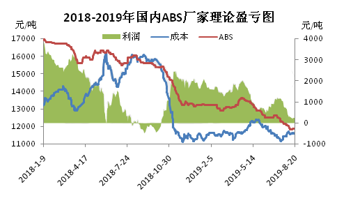 ????????自2019年4月中旬起,國內(nèi)ABS市場開啟持續(xù)下滑走勢。截至8月20日,華東ABS市場國產(chǎn)料主流報盤在11450-12300元/噸,而國產(chǎn)ABS企業(yè)理論生產(chǎn)成本至11571元/噸。部分低端ABS已跌破理論生產(chǎn)成本線,高端料理論上盈利水平亦縮至低位。成本面支撐下,ABS市場表現(xiàn)出一定的抗跌性。