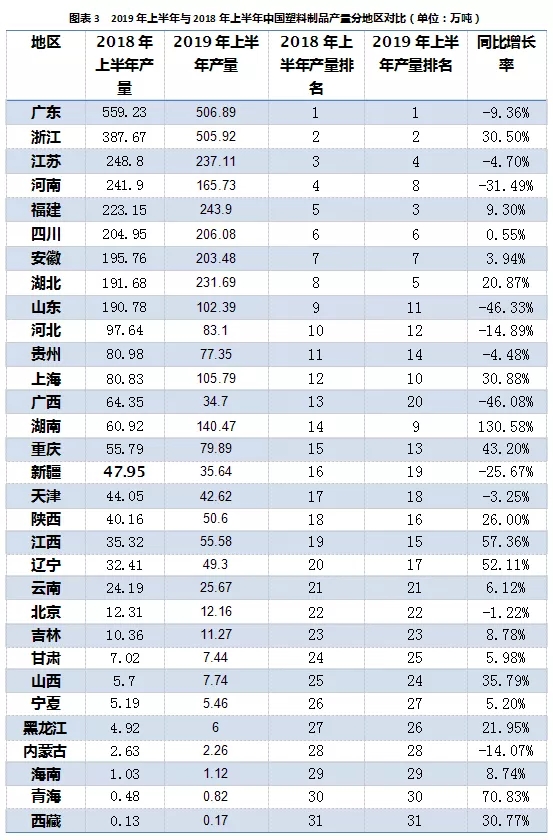 ????????1-6月塑料制品累計產(chǎn)量排名前五位(廣東、浙江、福建、江蘇和湖北)的總產(chǎn)量達到1725.51萬噸,占到全國總產(chǎn)量53.3%。(按6月規(guī)模企業(yè)統(tǒng)計)