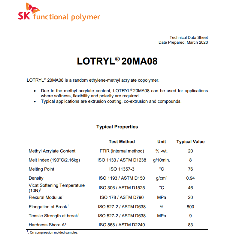 - 阿科瑪增韌劑相容劑EMA Lotryl 20MA08 物性表, 阿科瑪增韌劑相容劑EMA Lotryl 20MA08 產(chǎn)品參數(shù),阿科瑪增韌劑相容劑EMA Lotryl 20MA08 性能表,阿科瑪增韌劑相容劑EMA Lotryl 20MA08 出廠報告, MSDS,, 物質安全資料表, UL黃卡,{ SGS報告, RoHS, 食品級認證, NSF飲用水標準, 產(chǎn)品資料, 產(chǎn)品性能, 出廠報告, 原廠原包, 代理商, 熱變形溫度, 熔指數(shù), 流動系數(shù), 抗沖擊性能、沖擊強度, 低溫韌性、低溫抗沖擊性能, 熔體流動系數(shù)、熔體流動速率, 加工工藝、加工參數(shù)、加工溫度, 歐盟RoHS 德國FDA 美國FDA 日本FDA