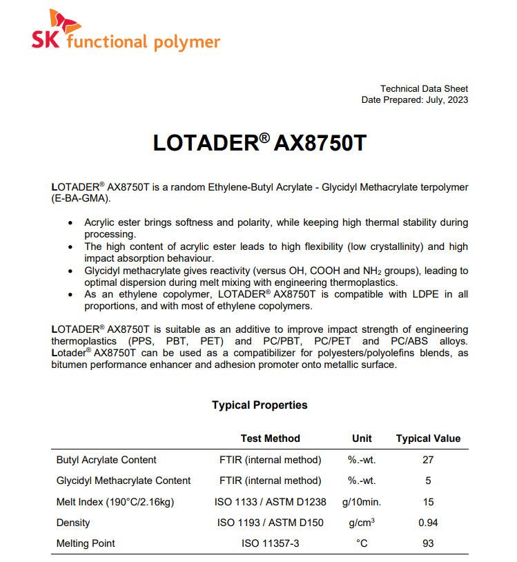 - EMA 法國阿科瑪 AX8750 塑料改性劑 粘結(jié)樹脂 PC加纖料改性兼容劑 物性表, EMA 法國阿科瑪 AX8750 塑料改性劑 粘結(jié)樹脂 PC加纖料改性兼容劑 產(chǎn)品參數(shù),EMA 法國阿科瑪 AX8750 塑料改性劑 粘結(jié)樹脂 PC加纖料改性兼容劑 性能表,EMA 法國阿科瑪 AX8750 塑料改性劑 粘結(jié)樹脂 PC加纖料改性兼容劑 出廠報(bào)告, MSDS,, 物質(zhì)安全資料表, UL黃卡,{ SGS報(bào)告, RoHS, 食品級(jí)認(rèn)證, NSF飲用水標(biāo)準(zhǔn), 產(chǎn)品資料, 產(chǎn)品性能, 出廠報(bào)告, 原廠原包, 代理商, 熱變形溫度, 熔指數(shù), 流動(dòng)系數(shù), 抗沖擊性能、沖擊強(qiáng)度, 低溫韌性、低溫抗沖擊性能, 熔體流動(dòng)系數(shù)、熔體流動(dòng)速率, 加工工藝、加工參數(shù)、加工溫度, 歐盟RoHS 德國FDA 美國FDA 日本FDA