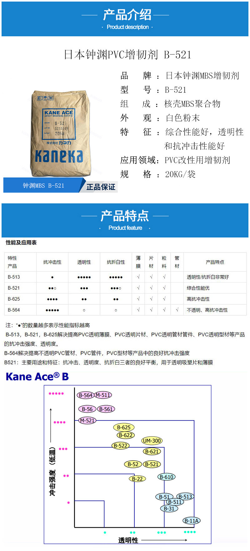 - 日本鐘淵mbs B521 透明抗沖擊綜合性能好 PVC改性增韌劑MBS521 物性表, 日本鐘淵mbs B521 透明抗沖擊綜合性能好 PVC改性增韌劑MBS521 產(chǎn)品參數(shù),日本鐘淵mbs B521 透明抗沖擊綜合性能好 PVC改性增韌劑MBS521 性能表,日本鐘淵mbs B521 透明抗沖擊綜合性能好 PVC改性增韌劑MBS521 出廠報(bào)告, MSDS,, 物質(zhì)安全資料表, UL黃卡,{ SGS報(bào)告, RoHS, 食品級(jí)認(rèn)證, NSF飲用水標(biāo)準(zhǔn), 產(chǎn)品資料, 產(chǎn)品性能, 出廠報(bào)告, 原廠原包, 代理商, 熱變形溫度, 熔指數(shù), 流動(dòng)系數(shù), 抗沖擊性能、沖擊強(qiáng)度, 低溫韌性、低溫抗沖擊性能, 熔體流動(dòng)系數(shù)、熔體流動(dòng)速率, 加工工藝、加工參數(shù)、加工溫度, 歐盟RoHS 德國(guó)FDA 美國(guó)FDA 日本FDA