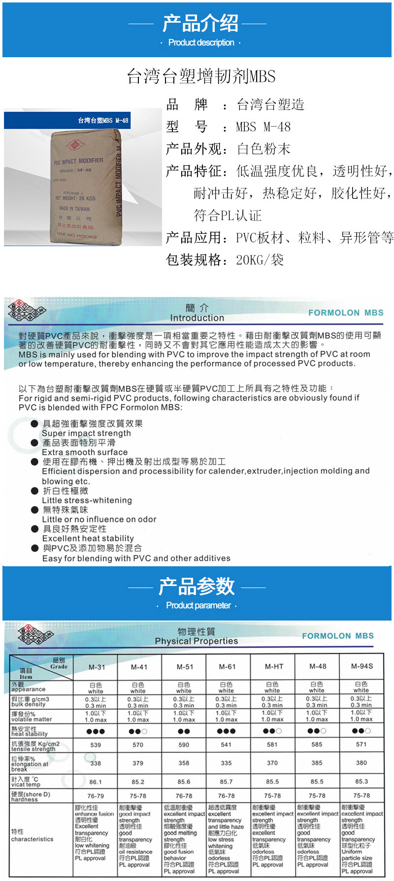 - 臺塑造MBS M48低溫強(qiáng)度好 透明MBS48 耐沖擊 PVC異形管增韌劑M-48 物性表, 臺塑造MBS M48低溫強(qiáng)度好 透明MBS48 耐沖擊 PVC異形管增韌劑M-48 產(chǎn)品參數(shù),臺塑造MBS M48低溫強(qiáng)度好 透明MBS48 耐沖擊 PVC異形管增韌劑M-48 性能表,臺塑造MBS M48低溫強(qiáng)度好 透明MBS48 耐沖擊 PVC異形管增韌劑M-48 出廠報(bào)告, MSDS,, 物質(zhì)安全資料表, UL黃卡,{ SGS報(bào)告, RoHS, 食品級認(rèn)證, NSF飲用水標(biāo)準(zhǔn), 產(chǎn)品資料, 產(chǎn)品性能, 出廠報(bào)告, 原廠原包, 代理商, 熱變形溫度, 熔指數(shù), 流動系數(shù), 抗沖擊性能、沖擊強(qiáng)度, 低溫韌性、低溫抗沖擊性能, 熔體流動系數(shù)、熔體流動速率, 加工工藝、加工參數(shù)、加工溫度, 歐盟RoHS 德國FDA 美國FDA 日本FDA
