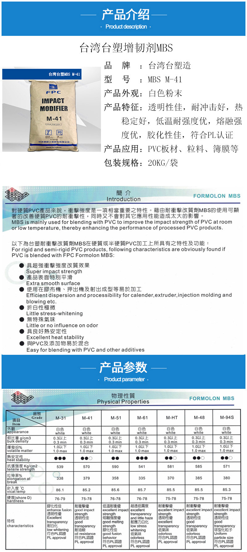 - 增韌劑M-41 透明 耐油級 低溫抗沖擊 PVC熱穩(wěn)定 MBS臺塑M41 物性表, 增韌劑M-41 透明 耐油級 低溫抗沖擊 PVC熱穩(wěn)定 MBS臺塑M41 產(chǎn)品參數(shù),增韌劑M-41 透明 耐油級 低溫抗沖擊 PVC熱穩(wěn)定 MBS臺塑M41 性能表,增韌劑M-41 透明 耐油級 低溫抗沖擊 PVC熱穩(wěn)定 MBS臺塑M41 出廠報告, MSDS,, 物質(zhì)安全資料表, UL黃卡,{ SGS報告, RoHS, 食品級認(rèn)證, NSF飲用水標(biāo)準(zhǔn), 產(chǎn)品資料, 產(chǎn)品性能, 出廠報告, 原廠原包, 代理商, 熱變形溫度, 熔指數(shù), 流動系數(shù), 抗沖擊性能、沖擊強(qiáng)度, 低溫韌性、低溫抗沖擊性能, 熔體流動系數(shù)、熔體流動速率, 加工工藝、加工參數(shù)、加工溫度, 歐盟RoHS 德國FDA 美國FDA 日本FDA