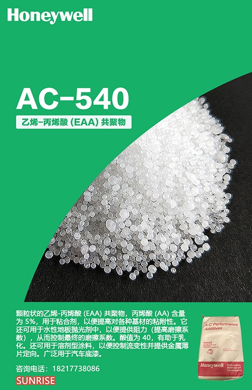 霍尼韋爾A-C 540A為粉末狀的乙烯-丙烯酸 (EAA) 共聚物,丙烯酸 (AA) 含量為 5%,用于粘合劑,以便提高對各種基材的粘附性?;裟犴f爾PE蠟A-C 540A還可用于水性地板拋光劑中,以便提供阻力(提高磨擦系數(shù))?;裟犴f爾PE蠟A-C 540A酸值為40,有助于乳化。還可用于溶劑型涂料,以便控制流變性并提供金屬薄片定向。廣泛用于汽車底漆。霍尼韋爾PE蠟A-C 540A還可用于色母粒和工程樹脂的分散劑。