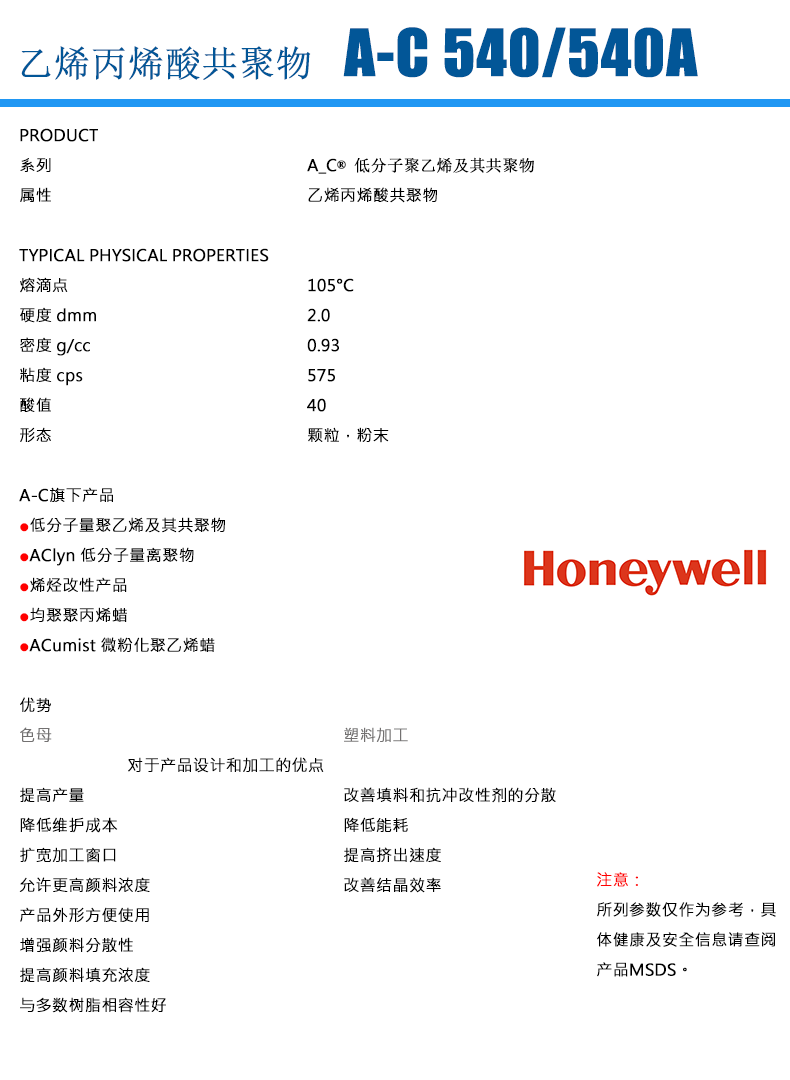 - Honeywell霍尼韋爾 A C 540 蠟粉蠟乳液 物性表, Honeywell霍尼韋爾 A C 540 蠟粉蠟乳液 產品參數(shù),Honeywell霍尼韋爾 A C 540 蠟粉蠟乳液 性能表,Honeywell霍尼韋爾 A C 540 蠟粉蠟乳液 出廠報告, MSDS,, 物質安全資料表, UL黃卡,{ SGS報告, RoHS, 食品級認證, NSF飲用水標準, 產品資料, 產品性能, 出廠報告, 原廠原包, 代理商, 熱變形溫度, 熔指數(shù), 流動系數(shù), 抗沖擊性能、沖擊強度, 低溫韌性、低溫抗沖擊性能, 熔體流動系數(shù)、熔體流動速率, 加工工藝、加工參數(shù)、加工溫度, 歐盟RoHS 德國FDA 美國FDA 日本FDA