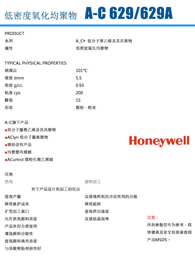 - 美國霍尼韋爾 honeywell 氧化聚乙烯蠟 AC 629 物性表, 美國霍尼韋爾 honeywell 氧化聚乙烯蠟 AC 629 產品參數(shù),美國霍尼韋爾 honeywell 氧化聚乙烯蠟 AC 629 性能表,美國霍尼韋爾 honeywell 氧化聚乙烯蠟 AC 629 出廠報告, MSDS,, 物質安全資料表, UL黃卡,{ SGS報告, RoHS, 食品級認證, NSF飲用水標準, 產品資料, 產品性能, 出廠報告, 原廠原包, 代理商, 熱變形溫度, 熔指數(shù), 流動系數(shù), 抗沖擊性能、沖擊強度, 低溫韌性、低溫抗沖擊性能, 熔體流動系數(shù)、熔體流動速率, 加工工藝、加工參數(shù)、加工溫度, 歐盟RoHS 德國FDA 美國FDA 日本FDA
