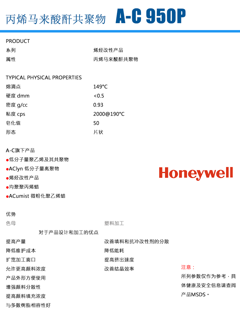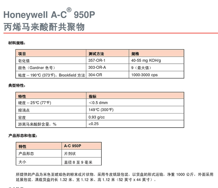 - 霍尼韋爾 honeywell 丙烯馬來(lái)酸酐共聚物 A-C 950P 適用熱熔膠電纜塑料改性 物性表, 霍尼韋爾 honeywell 丙烯馬來(lái)酸酐共聚物 A-C 950P 適用熱熔膠電纜塑料改性 產(chǎn)品參數(shù),霍尼韋爾 honeywell 丙烯馬來(lái)酸酐共聚物 A-C 950P 適用熱熔膠電纜塑料改性 性能表,霍尼韋爾 honeywell 丙烯馬來(lái)酸酐共聚物 A-C 950P 適用熱熔膠電纜塑料改性 出廠報(bào)告, MSDS,, 物質(zhì)安全資料表, UL黃卡,{ SGS報(bào)告, RoHS, 食品級(jí)認(rèn)證, NSF飲用水標(biāo)準(zhǔn), 產(chǎn)品資料, 產(chǎn)品性能, 出廠報(bào)告, 原廠原包, 代理商, 熱變形溫度, 熔指數(shù), 流動(dòng)系數(shù), 抗沖擊性能、沖擊強(qiáng)度, 低溫韌性、低溫抗沖擊性能, 熔體流動(dòng)系數(shù)、熔體流動(dòng)速率, 加工工藝、加工參數(shù)、加工溫度, 歐盟RoHS 德國(guó)FDA 美國(guó)FDA 日本FDA