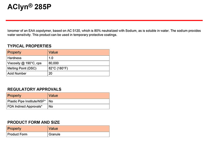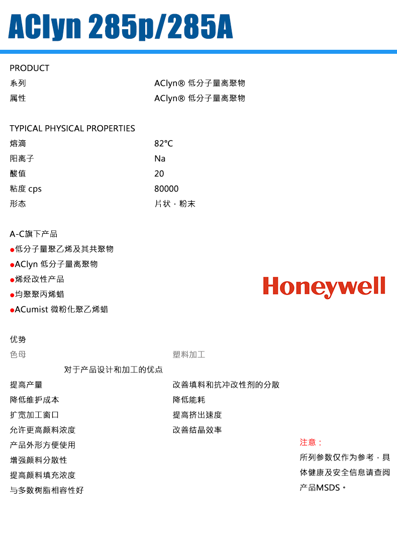- 霍尼韋爾EAA離聚物蠟粉AClyn® 285P 結(jié)晶成核劑 物性表, 霍尼韋爾EAA離聚物蠟粉AClyn® 285P 結(jié)晶成核劑 產(chǎn)品參數(shù),霍尼韋爾EAA離聚物蠟粉AClyn® 285P 結(jié)晶成核劑 性能表,霍尼韋爾EAA離聚物蠟粉AClyn® 285P 結(jié)晶成核劑 出廠報告, MSDS,, 物質(zhì)安全資料表, UL黃卡,{ SGS報告, RoHS, 食品級認證, NSF飲用水標準, 產(chǎn)品資料, 產(chǎn)品性能, 出廠報告, 原廠原包, 代理商, 熱變形溫度, 熔指數(shù), 流動系數(shù), 抗沖擊性能、沖擊強度, 低溫韌性、低溫抗沖擊性能, 熔體流動系數(shù)、熔體流動速率, 加工工藝、加工參數(shù)、加工溫度, 歐盟RoHS 德國FDA 美國FDA 日本FDA