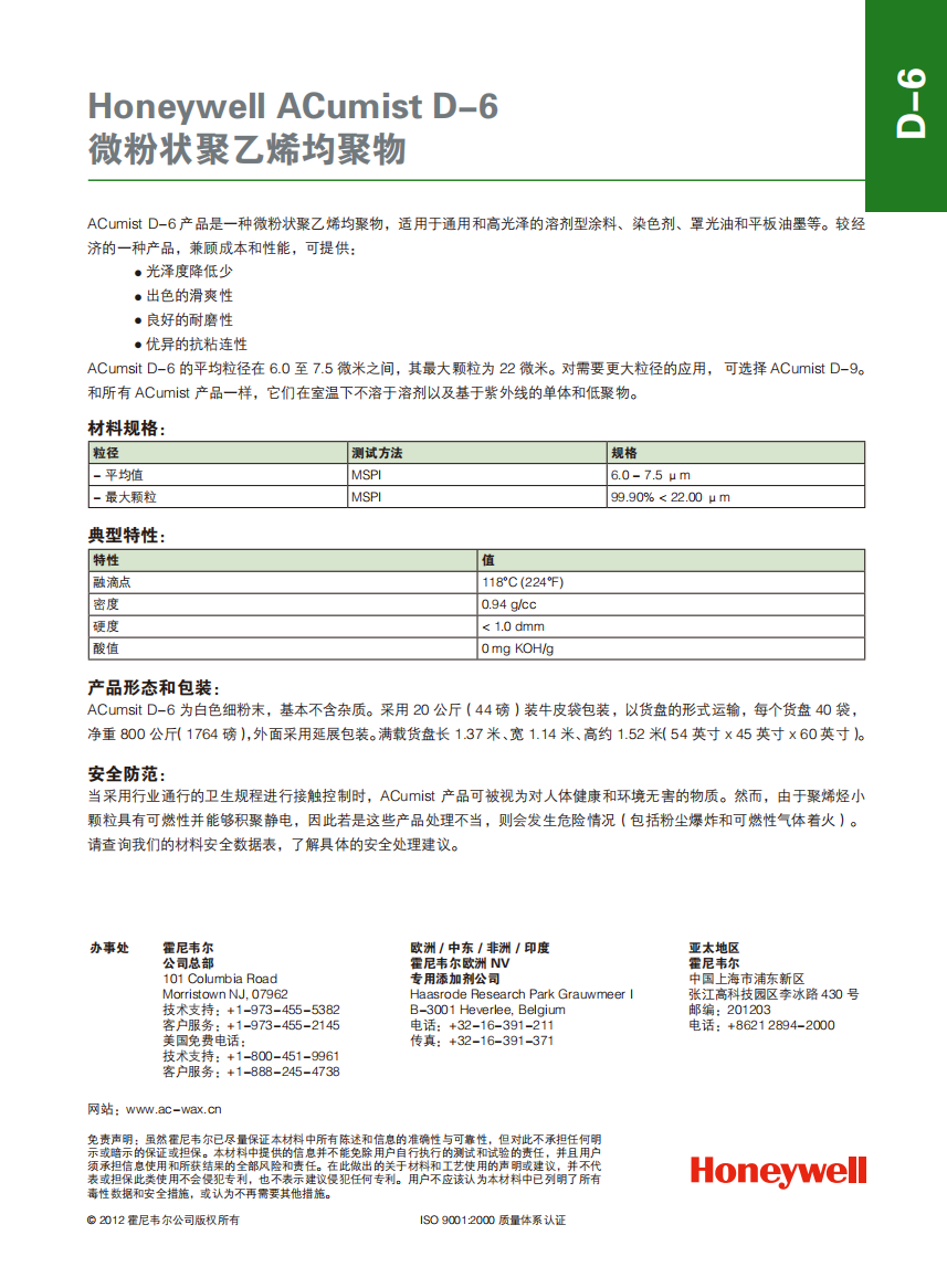 - 霍尼韋爾微粉蠟D6聚乙烯均聚物Honeywell ACumist D-6 物性表, 霍尼韋爾微粉蠟D6聚乙烯均聚物Honeywell ACumist D-6 產(chǎn)品參數(shù),霍尼韋爾微粉蠟D6聚乙烯均聚物Honeywell ACumist D-6 性能表,霍尼韋爾微粉蠟D6聚乙烯均聚物Honeywell ACumist D-6 出廠報(bào)告, MSDS,, 物質(zhì)安全資料表, UL黃卡,{ SGS報(bào)告, RoHS, 食品級認(rèn)證, NSF飲用水標(biāo)準(zhǔn), 產(chǎn)品資料, 產(chǎn)品性能, 出廠報(bào)告, 原廠原包, 代理商, 熱變形溫度, 熔指數(shù), 流動(dòng)系數(shù), 抗沖擊性能、沖擊強(qiáng)度, 低溫韌性、低溫抗沖擊性能, 熔體流動(dòng)系數(shù)、熔體流動(dòng)速率, 加工工藝、加工參數(shù)、加工溫度, 歐盟RoHS 德國FDA 美國FDA 日本FDA