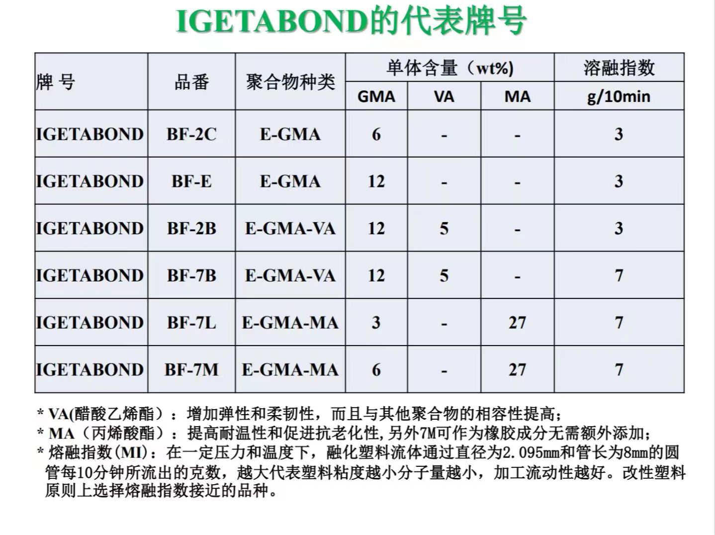 BF-E屬于乙烯-GMA的二元共聚物,主要用于PBT、PET、PC、PA和PBT/PC、PET/PC等,主要是作為增韌相容劑來使用。